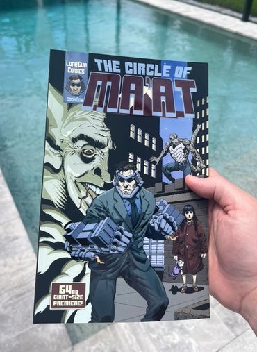 Enter into the world of Lone Gun Comics and land on the hard grey pavement of NYC 1955 where the vigilante called Iron-Demon has been attacking the Sabatini Crime Family in pursuit of its leader Boss Vito Sabatini. Vito has been forced to hide for weeks and watch as his soldiers are battered and beaten by the man who has publicly sworn to rain cold hard iron fists on Vito himself. This whole time a weird and strange creature watches the Demon’s showdown with the Sabatini family and Vito the cruel. What does the creature want? Why is he watching? Is he friend or foe? To get answers fund this book and allow Lone Gun comics to entertain and deliver The Circle of Maat to your doorstep. Take a gander at the covers below and read the first ten pages below to whet your appetite for what’s to come. Colored by Kid Zowsti , lettered by Eric Weathers and written and drawn by yours truly!!